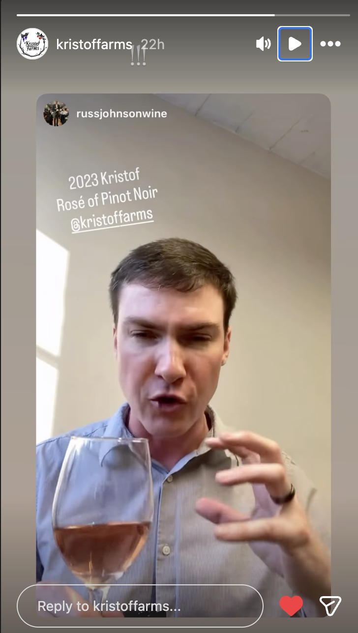 We were delighted to see wine reviewer Russ Johnson recently feature our 2023 Kristof Rosé of Pinot Noir in a short Instagram story. What made it especially meaningful? He first praised our Pinot Noir.